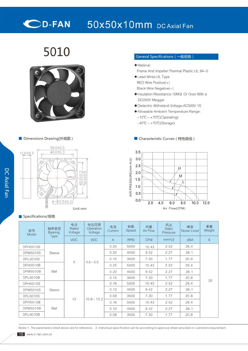 材料: 框架和葉輪:熱塑UL 94-0 引線.UL類型 紅色導線正極(+) 黑線負極(-) 絕緣電阻:10MΩ或以上,帶DC250V高阻表 介電耐壓:AC500V 1S 允許環境溫度範圍: -10℃-+70℃(運行) -40℃-+70℃(儲存)